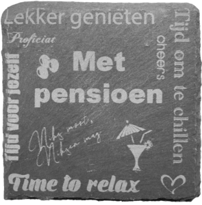 Leisteen onderzetter als geschenk voor iemand die met pensioen gaat.
